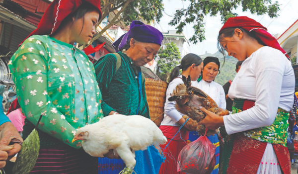 Dès 04h00 du matin, le marché s’anime avec le bruit des véhicules et des discussions. Ici, les animaux destinés à la vente, tels que les chiens, les cochons et les poules, ne sont pas enfermés dans des cages comme dans d’autres marchés des plaines, mais transportés sous l’aisselle ou tirés avec une corde. Les buffles et les bœufs, quant à eux, arborent des clochettes autour du cou, attendant sagement les acheteurs à proximité de leurs propriétaires.