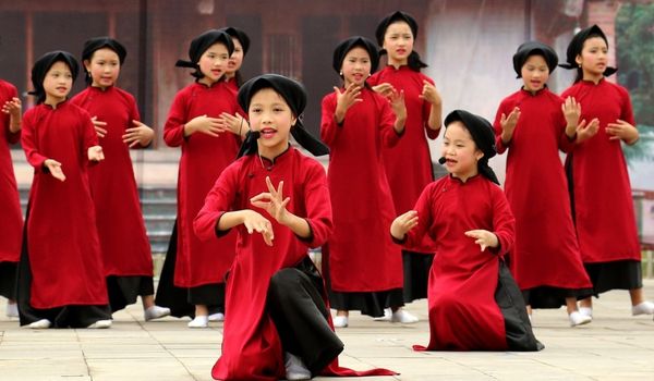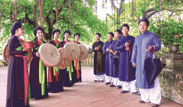 Lors de chanter Quan Ho Bac Ninh, reconnu comme patrimoine culturel immatériel par l’UNESCO en 2009, es femmes, arborant de grands chapeaux ronds (le Nón Quai Thao) et des foulards distinctifs, chantent avec émotion, exprimant des états tels que le désir et la tristesse liés à la séparation, ainsi que la joie des retrouvailles amoureuses. Les hommes répondent avec des mélodies similaires mais des paroles différentes. Leurs costumes traditionnels comprennent des turbans, des parapluies et des tuniques.