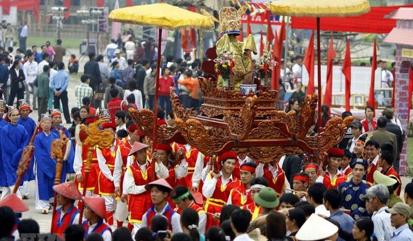 La plus grande cérémonie, la fête ancestrale de l’anniversaire des rois Hung, s’étend sur environ une semaine, se déroulant au début du troisième mois lunaire. Durant cette période, les habitants des villages voisins revêtent des costumes somptueux et rivalisent pour présenter le meilleur palanquin ainsi que les objets de culte les plus précieux lors du rite clé. Celui-ci implique le transport des tambours et des gongs vers le site principal du temple.