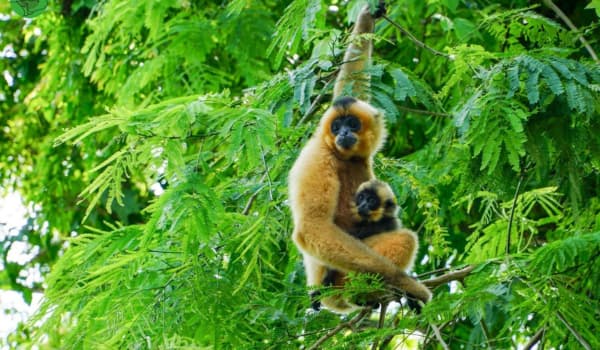 Une mère gibbon à joues jaunes protège tendrement son petit — une espèce rare observée au parc national de Cát Tiên, joyau de la biodiversité vietnamienne. (Photo: VQG Cat Tien)