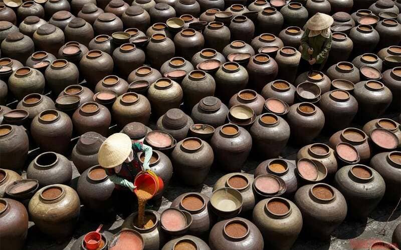 Le village de Ban Yen Nhan, souvent désigné comme le « village de la sauce soja », se trouve dans la province de Hung Yen, non loin de Hanoï. Il est réputé pour son expertise traditionnelles dans la production de cette sauce emblématique. À l’opposé de la sauce soja noire fréquemment employée en cuisine chinoise, la sauce soja de Ban se caractérise par sa consistance épaisse, son teint doré et son arôme subtilement sucré-salé. Elle se marie parfaitement avec les rouleaux de printemps ou rehausse les plats sautés, apportant une note unique et authentique à chaque plat.