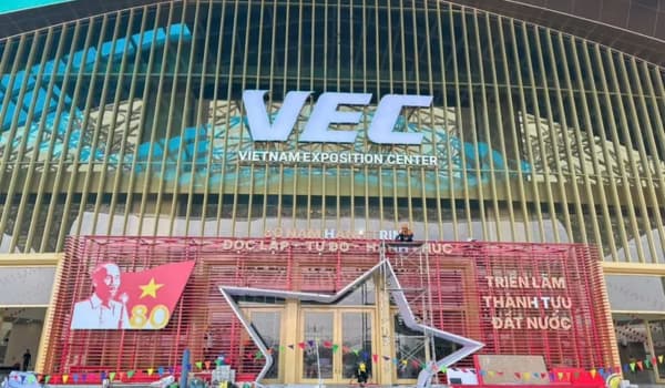 Le Vietnam Exposition Center (VEC) accueille une grande exposition marquant les 80 ans de la Fête nationale du Vietnam, avec des décors patriotiques et symboliques. Photo: VTV.cn)
